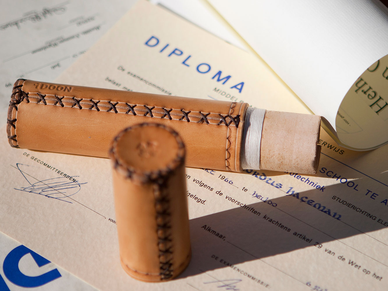 Een mooie hand genaaide leren koker voor oorkondes, diploma’s of certificaten. Belangrijke documenten die vaak officieel aan de (nieuwe) eigenaar worden overgedragen. Deze documentenkoker kan een uniek onderdeel uitmaken van een dergelijke ceremonie. Daarnaast biedt de koker bescherming voor de toekomst van deze stukken.