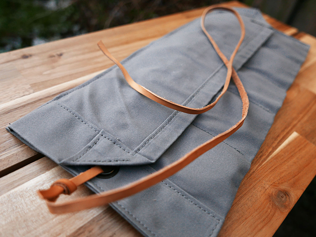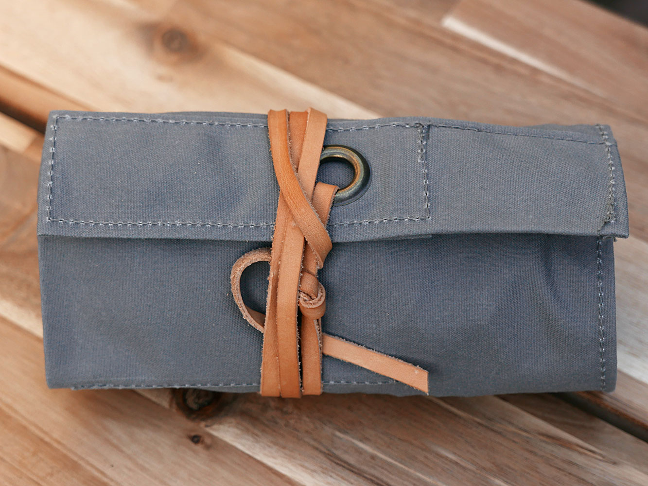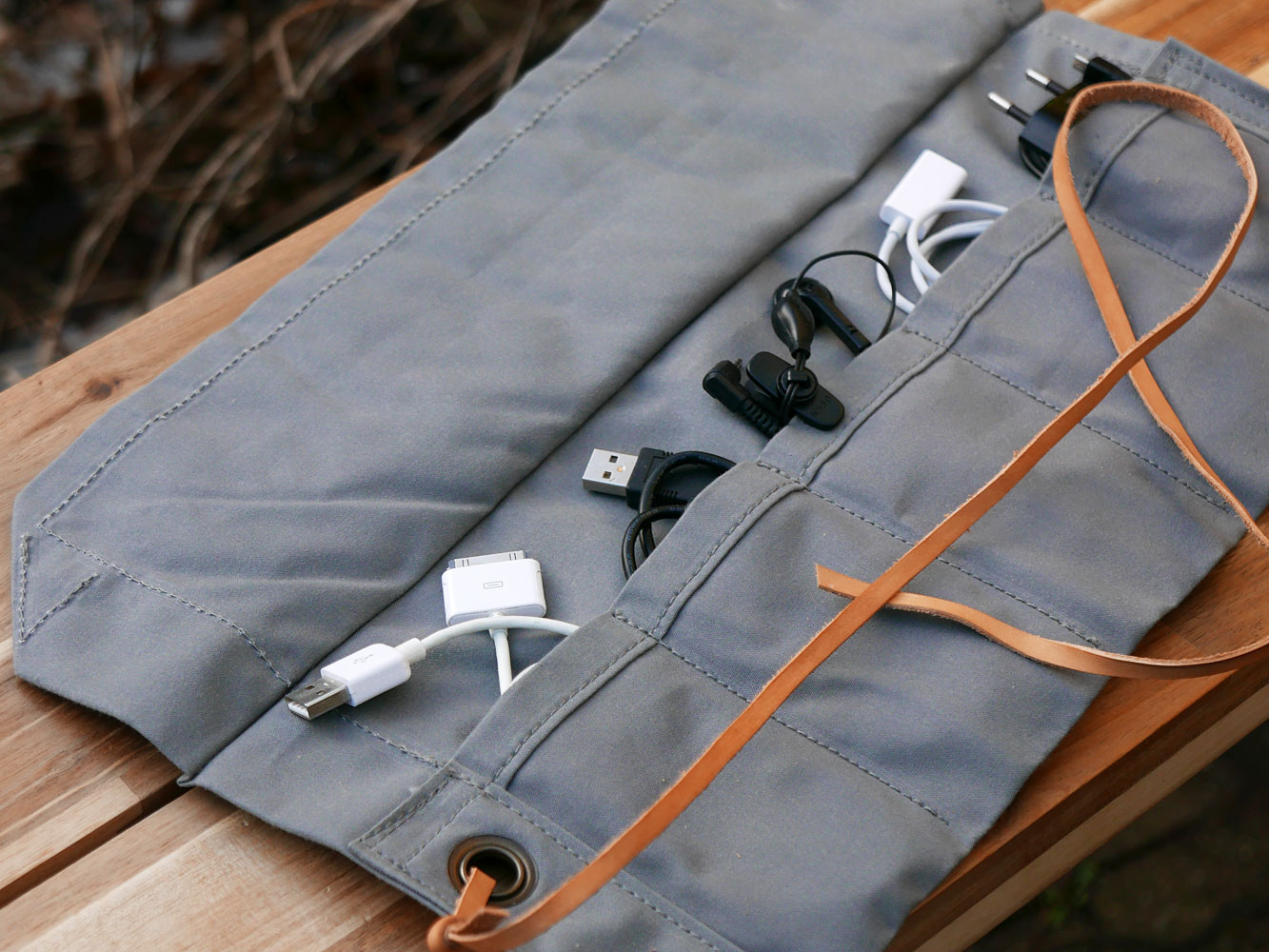 Een superhandig roletui om al je snoertjes, oortjes en laders overzichtelijk bij de hand en goed beschermd mee op pad te nemen. Ook te gebruiken voor schrijfgerei, gereedschap, toiletartikelen, horloges, scharen, bandenplakset of wat dan ook. Het stevig canvas, zeiloog en leren veter maken dit een stoer “industrial” roletui.
