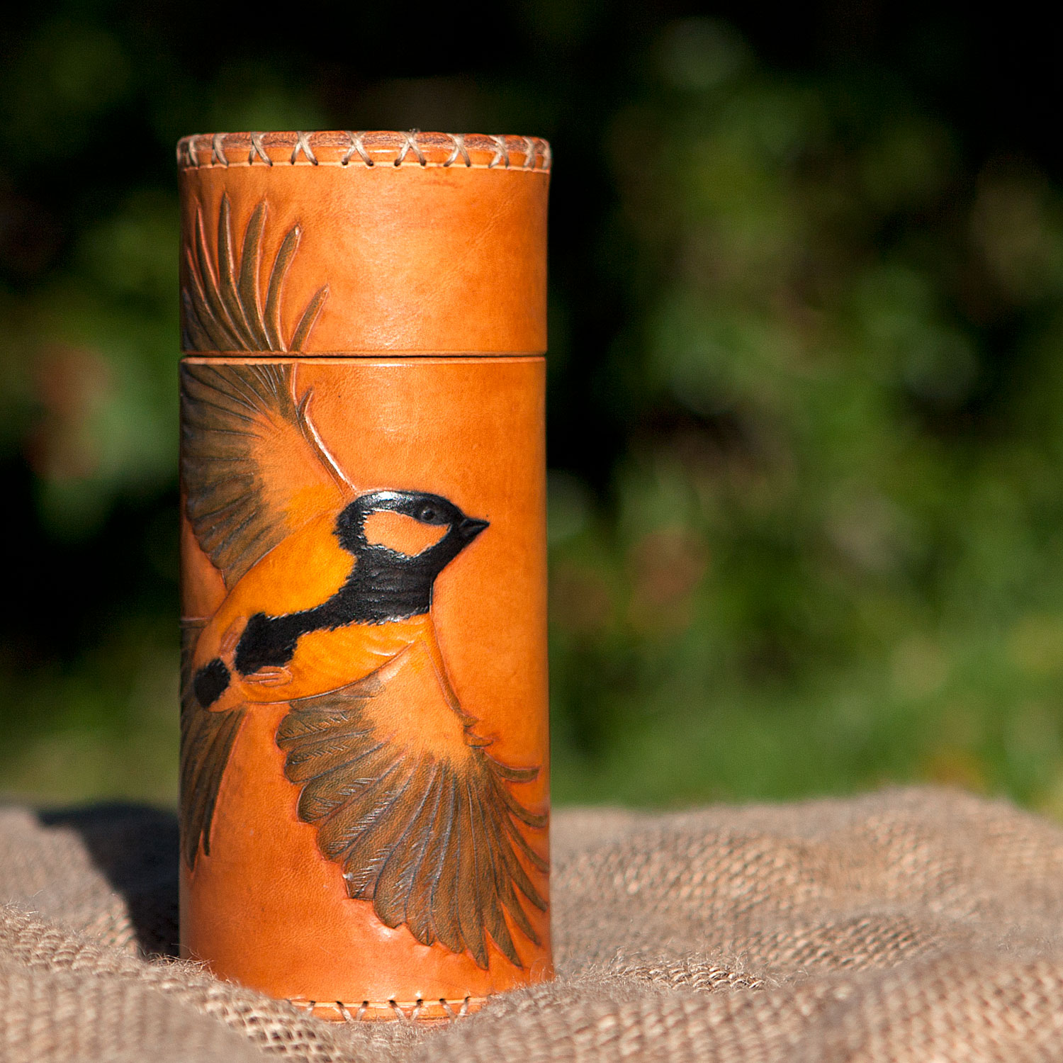 Pear shader, camouflage, veiner en seeder zijn enkele namen van slagstempels die ik gebruik bij het aanbrengen van reliëf in afbeeldingen op leer. Op deze bus een parus major, ofwel koolmees in vlucht, ik heb een zwak voor vogels. Rond deze tijd voer ik ze bij met voer en water, ze kunnen ze vanwege de kou en voedselschaarste wel een extraatje gebruiken.